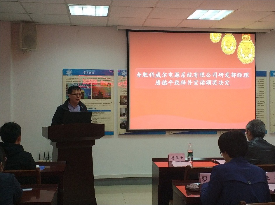 唐德平致辞并宣读颁奖决定。合肥乐鱼电源系统有限公司是一家从事于交直流电源和仪器开发的科技创新型公司,希望通过设立助学金,培养并吸收更多的创新型人才,希望同学们再接再厉,学习更上一层楼。