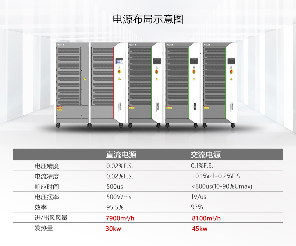 某第三方实验室搭建一套600KW的光储测试平台,配置A2000系列225KW交流源三台、D2000系列600KW直流源一台。客户实验室总面积为20平方米的密闭房间,设备有效摆放面积10平方,需预留10平方米被测件区域。